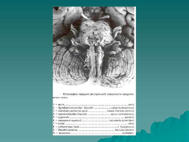 1. Верхнее двухолмие 2. Нижнее двухолмие 3. Ручка верхнего холмика 4. Ручка нижнего холмика 5. Латеральное коленчатое тело 6. Медиальное коленчатое тело 7. Таламус 8. Эпифиз 9. Крыша 4 -го желудочка 10. Средний мозг 11. Верхний мозговой парус