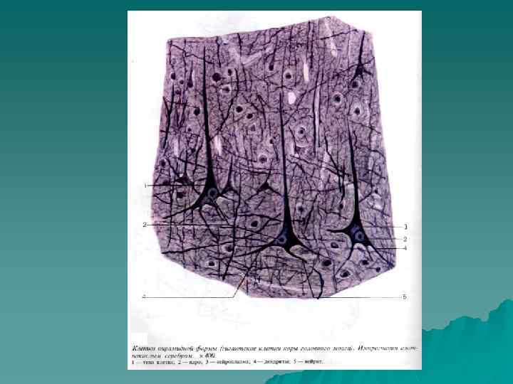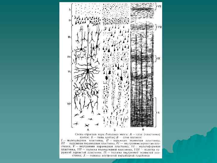2 1. Молекулярный слой коры мозжечка 2. Глиальные клетки 3. Грушевидные нейроны 4. Клетки-зерна 5. Белое вещество 4 1 3 5 1 3 3 4