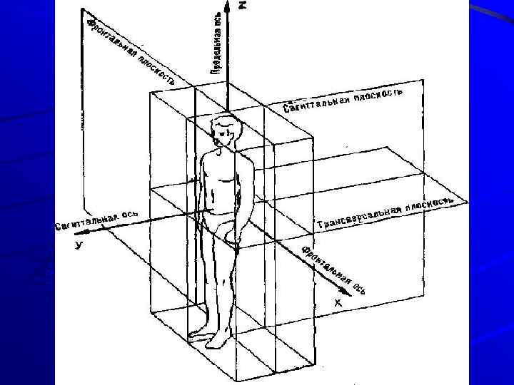 Описание поз и движений человека Анатомическая позиция - человек стоит прямо, позвоночный столб принимает анатомически правильное положение, плечевые суставы не перемещаются вперед и лопатки сведены, стопы и ладони обращены вперед. Такое положение тела является эталоном для биомеханической оценки движений в суставах. Саггитальная плоскость – делит тело на левую и правую стороны. Фронтальная плоскость – делит тело на переднюю и заднюю части. Поперечная плоскость – делит тело на верхний и нижний сегменты. Вертикальная ось (продольная) – супинация и пронация. Горизонтальная ось (поперечная) – сгибание и разгибание. Саггитальная ось (переднезадняя) – отведение и приведение. При изменении анатомической позиции эти оси и плоскости уже трудно определить!