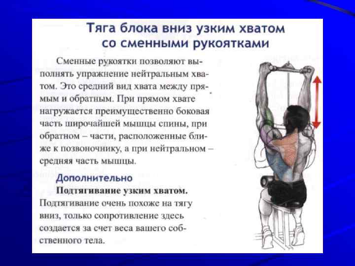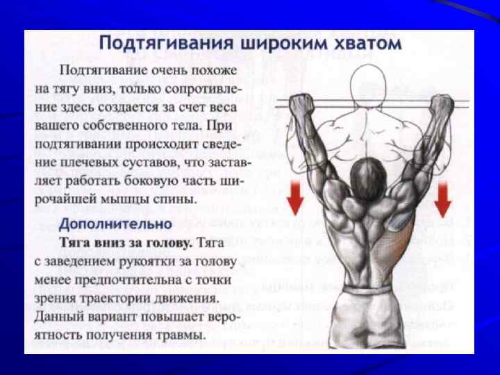ПРОРАБАТЫВАЕМЫЕ МЫШЦЫ Основные: Широчайшая мышца Дополнительные: задний пучок дельтовидной, нижний пучок трапециевидной, ромбовидные, бицепс