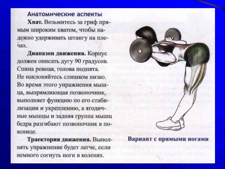 ПРОРАБАТЫВАЕМЫЕ МЫШЦЫ Основные: мышца, выпрямляющая позвоночник, ягодичная мышца, задняя группа мышц бедра Дополнительные: трапециевидная, широчайшие