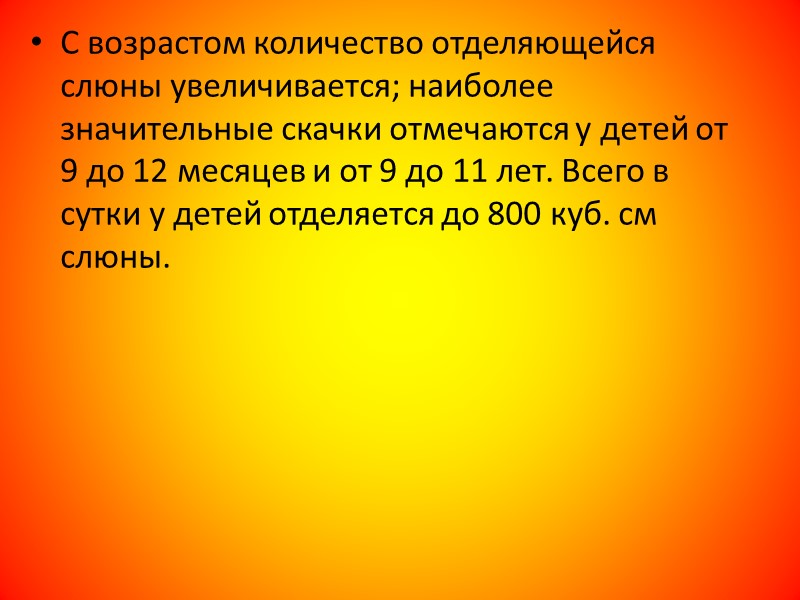 С возрастом количество отделяющейся слюны увеличивается; наиболее значительные скачки отмечаются у детей от 9 до 12 месяцев и от 9 до 11 лет. Всего в сутки у детей отделяется до 800 куб. см слюны.