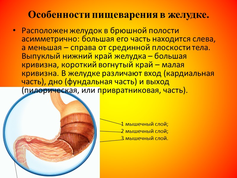Особенности пищеварения в желудке. Расположен желудок в брюшной полости асимметрично: большая его часть находится слева, а меньшая – справа от срединной плоскости тела. Выпуклый нижний край желудка – большая кривизна, короткий вогнутый край – малая кривизна. В желудке различают вход (кардиальная часть), дно (фундальная часть) и выход (пилорическая, или привратниковая, часть). 1 мышечный слой; 2 мышечный слой; 3 мышечный слой.