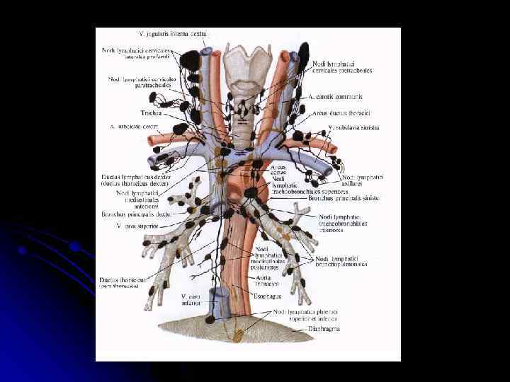 Лимфатическая система Верхний и средний этаж – в глубокие шейные лимфатические узлы Нижний этаж – в претрахеальные и лимфоузлы, расположенные по ходу внутренней яремной вены