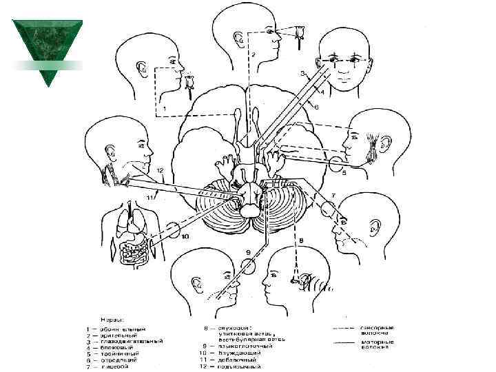 Ú 5. Лицевые нервы (VII) Черепномозговые нервы Ú Ú Ú выходят латеральнее отводящих нервов. 6. Преддверно улитковые нервы (VIII), выходят немного латеральнее лицевых нервов. 7. Языкоглоточные нервы (IХ) выходят позади олив. 8. Блуждающие нервы (X) выходят ниже языкоглоточных нервов. 9. Добавочные нервы (XI) выходят ниже блуждающих нервов. 10. Подъязычные нервы (XII) выходят между пирамидами и оливами продолговатого мозга.