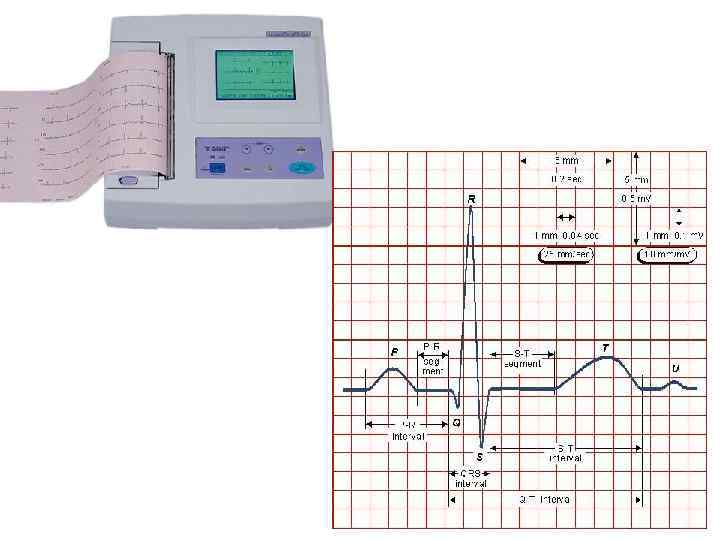 Электрокардиогра фия — методика регистрации и исследования электрических полей, образующихся при работе сердца. Электрокардиография представляет собой относительно недорогой, но ценный метод электрофизиологической инструментальной диагностики в кардиологии. ЭКГ — графическое представление разности потенциалов возникающих в результате работы сердца и проводящихся на поверхность тела. Зубец P отображает процесс охвата возбуждением миокарда предсердий, комплекс QRS — систолу желудочков, сегмент ST и зубец T отражают процессы реполяризации миокарда желудочков. Во время реполяризации ионы диффундируют в обратном направлении для восстановления прежнего электрического заряда мембраны, после чего клетка бывает готова к дальнейшей электрической активности.