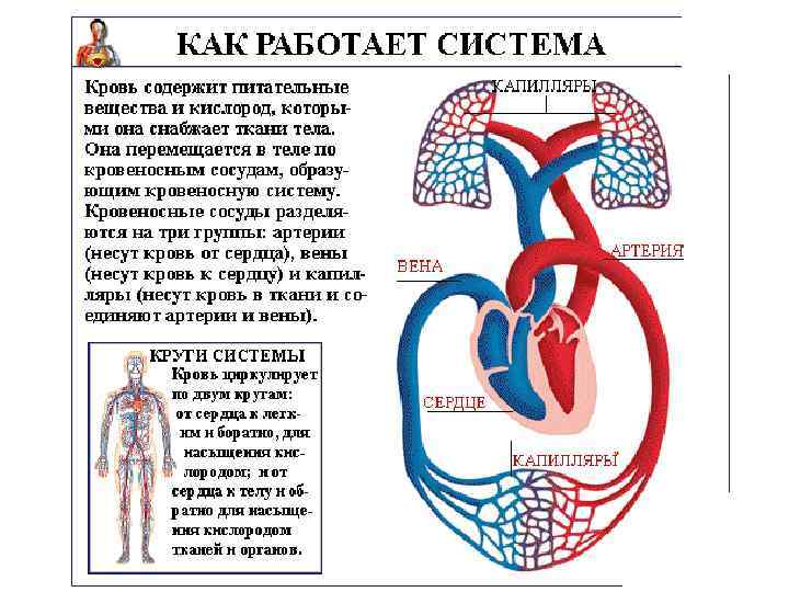 Сердце – это центральный орган кровообращения. Оно не только проталкивает кровь в сосуды и принимает кровь из них, но и регулирует движение жидкости в сосудах. Артериями называются кровеносные сосуды, по которым кровь течет от сердца к периферии – к органам и тканям. Вены –это кровеносные сосуды, по которым кровь возвращается к сердцу. Между артериями и венами находятся тончайшие кровеносные сосуды, называемые капиллярами.
