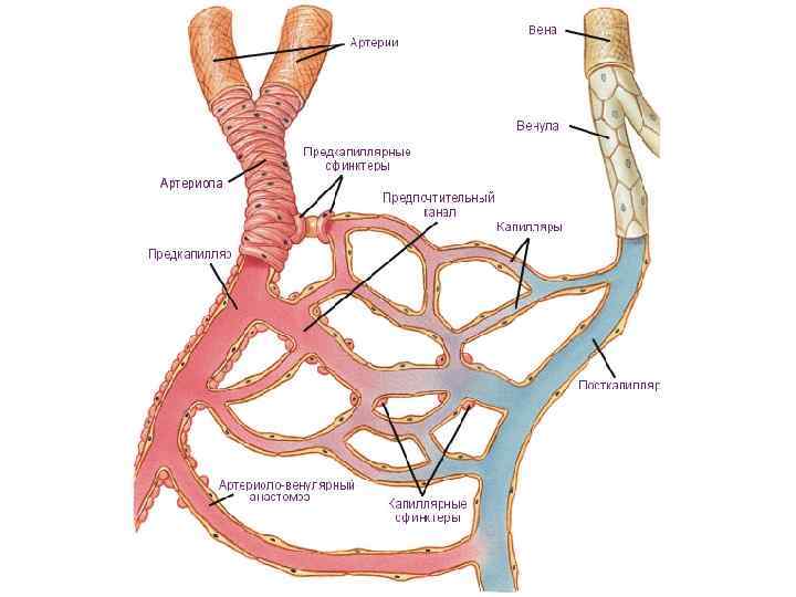 Капилляры • Прекапилляры (прекапиллярные артериолы) — тонкие микрососуды (диаметром около 15 мкм), отходящие от артериол и переходящие в гемокапилляры. Их стенка состоит из эндотелия, лежащего на базальной мембране, гладкомышечных клеток, расположенных поодиночке и наружных адвентициальных клеток. В местах отхождения от прекапиллярных артериол кровеносных капилляров имеются гладкомышечные сфинктеры. Последние регулируют приток крови к отдельным группам гемокапилляров и при отсутствии выраженной функциональной нагрузки на орган большая часть прекапиллярных сфинктеров закрыта. • Гемокапилляры. Наиболее тонкостенные сосуды микроциркуляторного русла, по которым кровь транспортируется из артериального звена в венозное. Из этого правила есть исключения: в клубочках почек гемокапилляры располагаются между приносящими и выносящими артериолами. Такие атипично расположенные кровеносные капилляры образуют сети, называемые чудесными. Функциональное значение гемокапилляров чрезвычайно велико. Они обеспечивают направленное движение крови и обменные процессы между кровью и тканями.