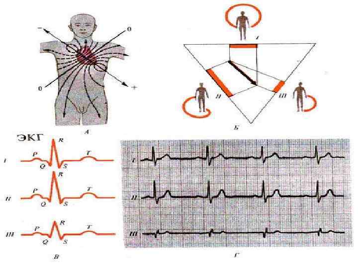 • Вследствие определенного положения сердца в грудной клетке и своеобразной формы тела человека электрические силовые линии, возникающие между возбужденными (-) и невозбужденными (+) участками сердца, распределяются по поверхности тела неравномерно. • По этой причине в зависимости от места приложения электродов форма ЭКГ и вольтаж ее зубцов будут различны. • Для регистрации ЭКГ производят отведение потенциалов от конечностей и поверхности грудной клетки. • Обычно используют три так называемых стандартных отведений от конечностей: • I отведение: правая рука — левая рука; • II отведение: правая рука — левая нога; • III отведение: левая рука — левая нога.