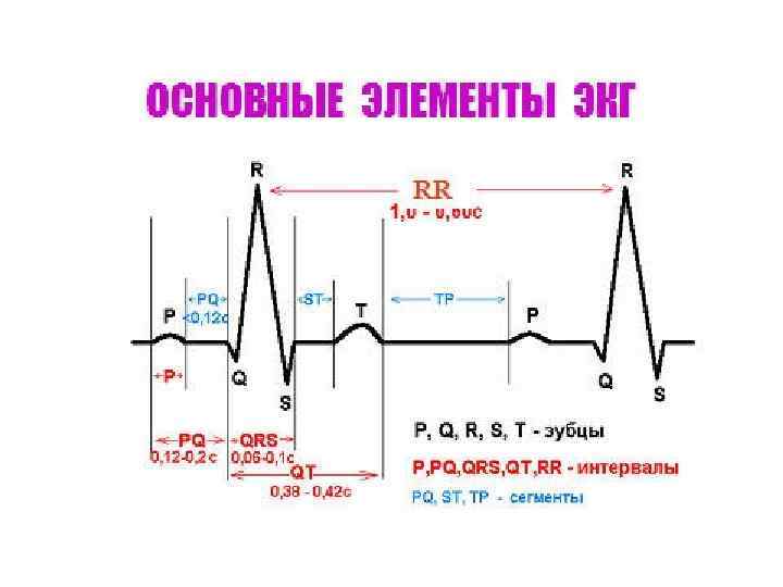 • Зубец Р отображает охват возбуждением предсердий и получил название предсердного. Далее возбуждение распространяется на предсердно-желудочковый узел и движется по проводящей системе желудочков. • В это время электрокардиограф регистрирует изопотенциальную линию (оба предсердия полностью возбуждены, оба желудочка еще не возбуждены, а движение возбуждения по проводящей системе желудочков не улавливается электрокардиографом — сегмент PQ на ЭКГ).