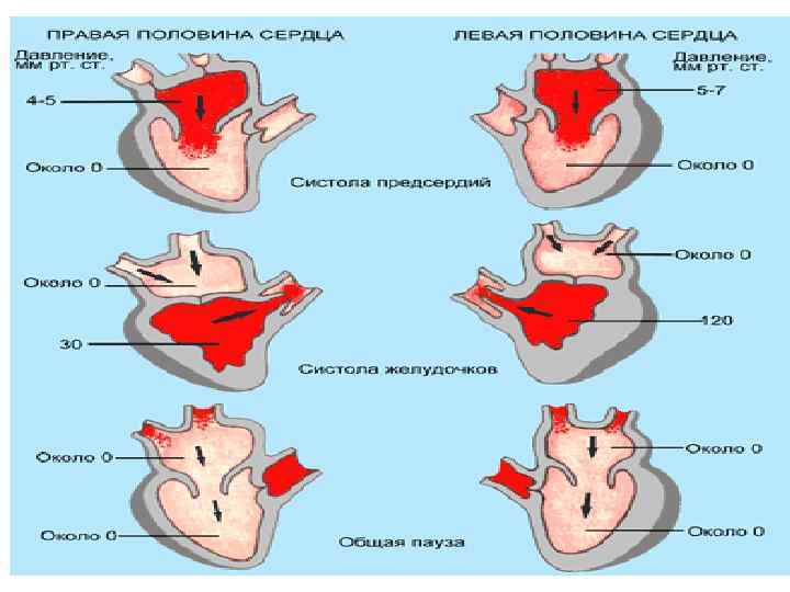 Цикл сердечных сокращений. • Насосная функция сердца осуществляется благодаря попеременным ритмическим сокращениям и расслаблениям миокарда предсердий и желудочков. • Сокращение называют систолой, а расслабление – диастолой. Систола и диастола в норме согласованы между собой и составляют цикл сердечной деятельности. • Каждый цикл начинается с систолы правого предсердия, с того места, где расположены устья полых вен. Затем волна сокращения охватывает оба предсердия, имеющих общую мускулатуру. • Длительность полного цикла сердечных сокращений составляет около 0, 8 с. • У человека в состоянии покоя сердце обычно сокращается и расслабляется 60 -70 раз в минуту.