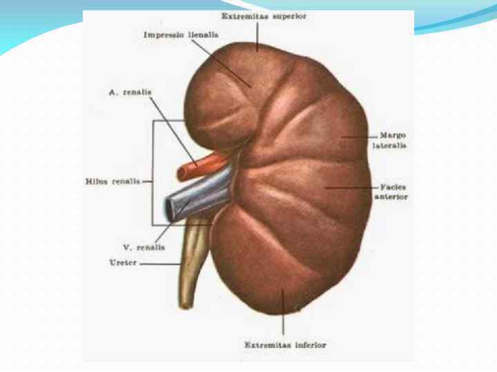 Почка имеет бобовидную форму, красно бурый цвет, гладкую поверхность, плотную консистенцию. Средняя масса органа составляет 120 г, длина 10— 12 см, ширина около 6 см, толщина 3— 4 см. В строении почки выделяют две поверхности: переднюю — более выпуклую и заднюю — сглаженную; два конца (полюса): верхний — закругленный и нижний — заостренный; два края: латеральный — выпуклый и медиальный — вогнутый. На медиальном крае располо жены ворота почки. В них входят почечная артерия и нерв, а выходят почечная вена, лимфатические сосуды и мочеточник. Все эти образования объединены понятием «почечная ножка» . У новорожденных, а иногда и у взрослых людей на поверхности почки видны борозды, разделяющие ее на доли.