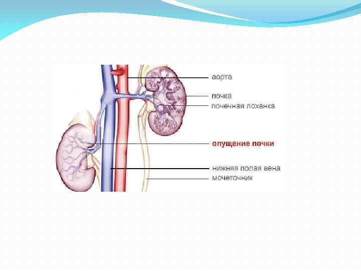 Почечная фасция, жировая капсула, мышечное почечное ложе и почечная ножка надежно фиксируют орган в строго определенном месте в забрюшинном пространстве. Они относятся к фиксирующему аппарату почки. Кроме того, в поддержании характерного положения органа важную роль играет внутрибрюшное давление. Если по каким либо причинам фиксирующий аппарат не обеспечивает соответствующее положение органа, возникает смещение почки вниз — нефроптоз.