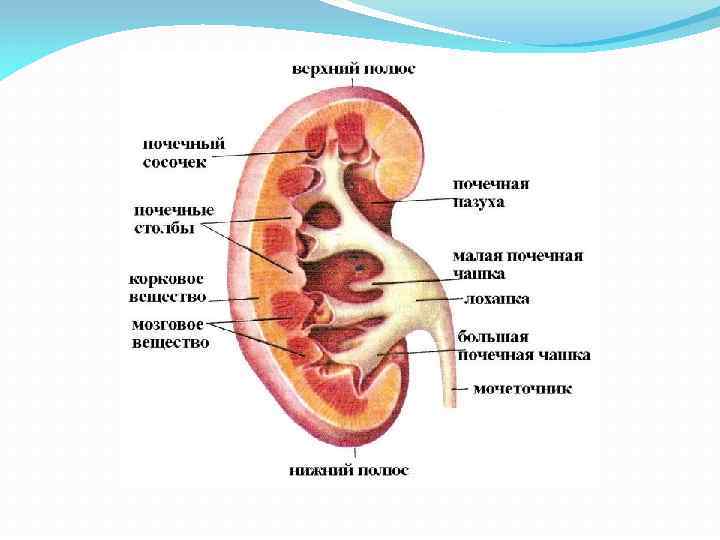 Мочевыводящие пути почки. Началом интраорганных мочевыводящих путей являются собирательные трубочки, в которые приносят вторичную мочу извитые канальцы II порядка. Они расположены в мозговом веществе. Собирательные трубочки сливаются, образуя сосочковые проточки. В области верхушки пирамиды они вливаются в малые чашки (всего их 12— 18).