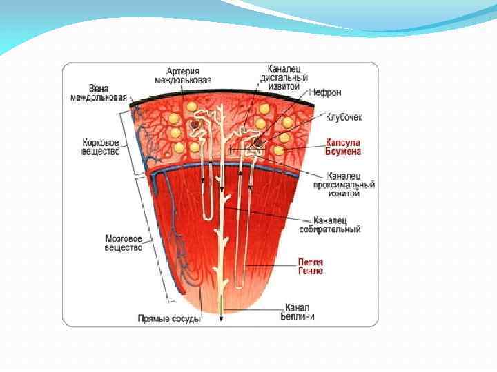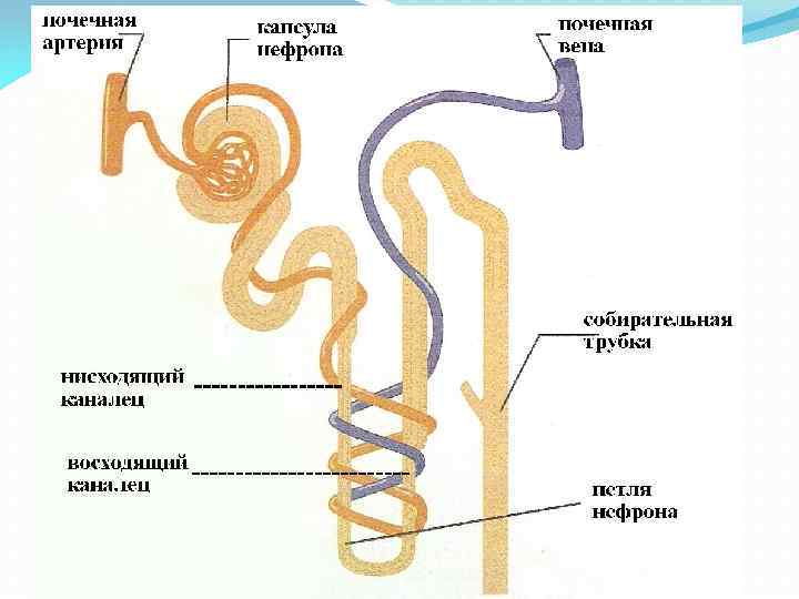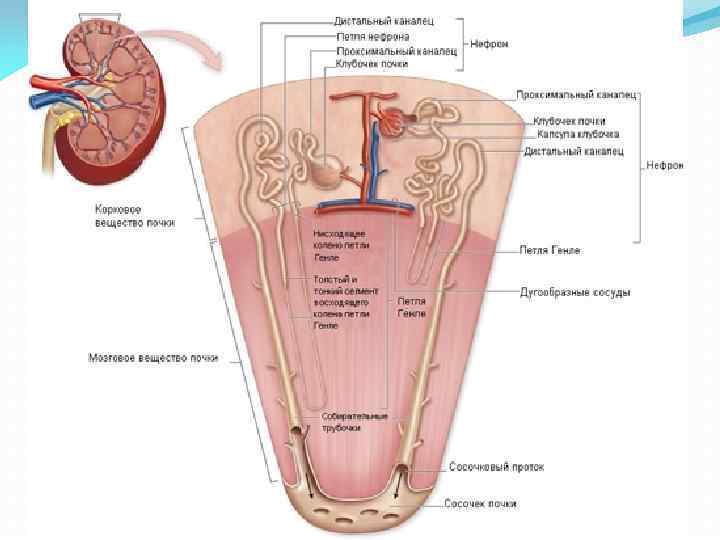 Структурно функциональной единицей почки является нефрон, общее количество которых составляет более 2 млн. Нефрон представляет собой длинный каналец, начальный отдел которого в виде двустенной чаши окружает капиллярный клубочек, а конечный — впадает в собирательную трубочку. В нефроне выделяют четыре отдела: почечное (Мальпигиево) тельце; извитой каналец первого порядка (проксимальный извитой каналец); петлю нефрона (Генле); извитой каналец второго порядка (дистальный извитой каналец).