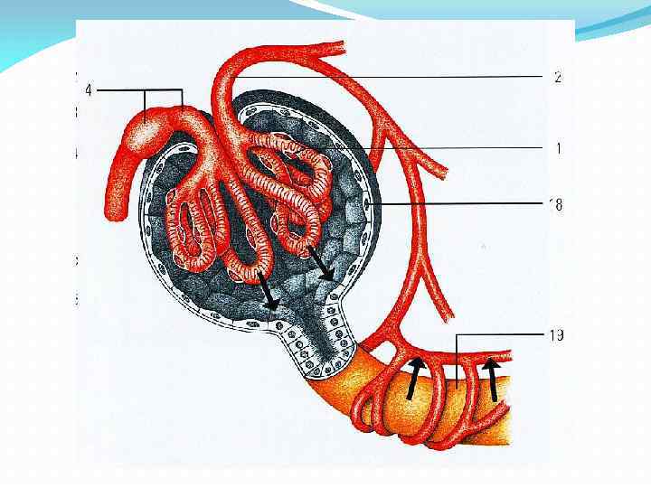 Конечные их ветви называют приносящи ми артериолами. Каждая из данных артериол входит в капсулу Шумлянского—Боумена, где распадается на капилляры и образует сосудистый клубочек — первичную капиллярную сеть почки. Многочисленные капилляры первичной сети в свою очередь собираются в выносящую артериолу, диаметр которой в два раза меньше диаметра приносящей. Таким образом, кровь из артериального сосуда попадает в капилляры, а затем в другой артериальный сосуд.