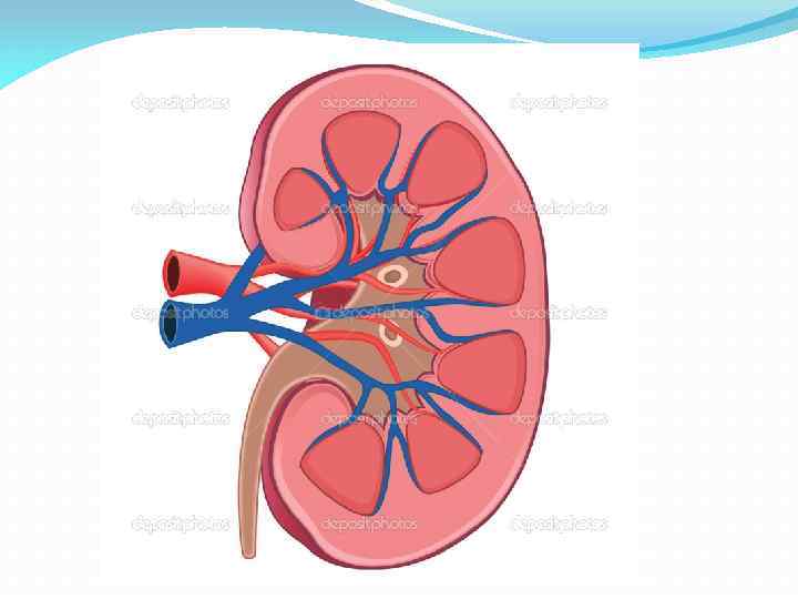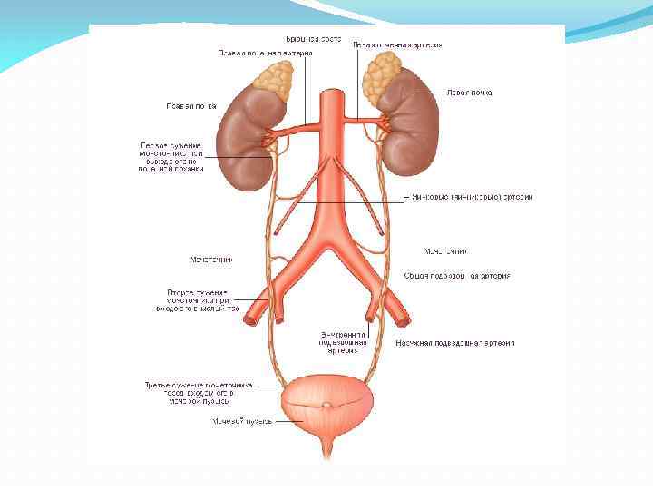 Кровоснабжение почки. Несмотря на свои относительно небольшие размеры, почка — один из наиболее кровоснабжаемых органов. За 1 мин через почки проходит до 20 — 25 % объема сердечного выброса. В течение 1 сут через эти органы весь объем крови человека проходит до 300 раз. Почечная артерия отходит непосредственно от брюшной аорты. В воротах почки она разветвляется на более мелкие артерии до артериол.