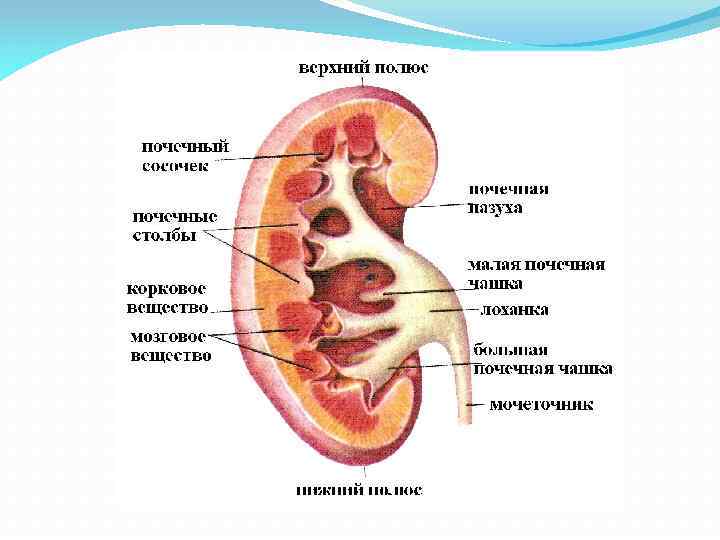 Паренхима почки состоит из двух слоев: наружного — коркового вещества, имеющего темно красный цвет, и внутреннего, более светлого — мозгового вещества. Мозговое вещество представлено почечными (Мальпигиевыми) пирамидами (всего их 12— 18), основание которых обращено к корковому веществу, а вершины — к центру. Корковое вещество на срезе почки занимает узкий наружный слой почечной паренхимы, а также участки между пирамидами, которые называют почечными столбами.