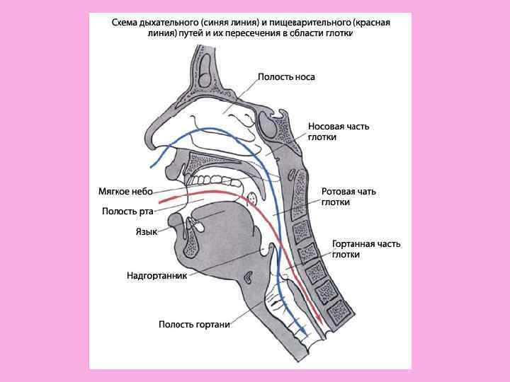 • Pars oralis, ротовая часть, представляет собой средний отдел глотки, который спереди сообщается через зев, fauces, с полостью рта; задняя же стенка его соответствует III шейному позвонку. По функции ротовая часть является смешанной, так как в ней происходит перекрест пищеварительного и дыхательного путей. Этот перекрест образовался в период развития органов дыхания из стенки первичной кишки. Из первичной носоротовой бухты образовались носовая и ротовая полости, причем носовая оказалась расположенной сверху или как бы дорсально по отношению к ротовой, а гортань, трахея и легкие возникли из вентральной стенки передней кишки. Поэтому головной отдел пищеварительного тракта оказался лежащим между носовой полостью (сверху и дорсально) и дыхательными путями (вентрально), чем и обусловлен перекрест пищеварительного и дыхательного трактов в области глотки.