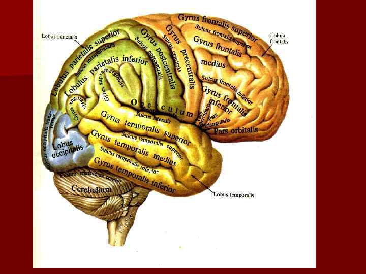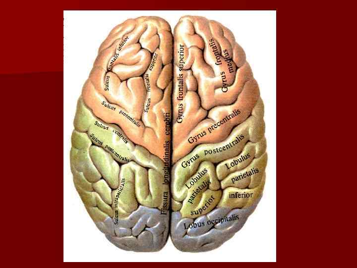 Извилины: 1 – прецентральная извилина; 2 – постцентральная извилина; 3, 4 – нижняя и верхняя теменные дольки; 5 – надкраевая извилина, 6 – угловая извилина; 7 – затылочные извилины; 8, 9, 10 – верхняя, средняя и нижняя височные извилины; 11 – покрышковая часть; 12 – треугольная часть; 13 – глазничная часть; 14, 15, 16 – нижняя, средняя и верхняя лобные извилины.