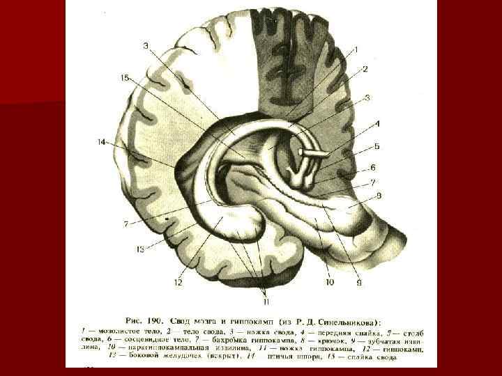 1, 2, 3 – колено, ствол и валик мозолистого тела, 18 – клюв мозолистого тела. 4, 5, 6 – столб, тело и ножки свода; 7 – спайка свода; 8 – бахромка гиппокампа; 9 – гиппокамп; 10 – сосцевидное тело; 11 – углубление воронки; 12 – гипофиз; 13 – зрительный углубление; 14 – зрительный перекрест; 15 – конечная пластинка; 16 – передняя спайка мозга; 17 – пластинка клюва;