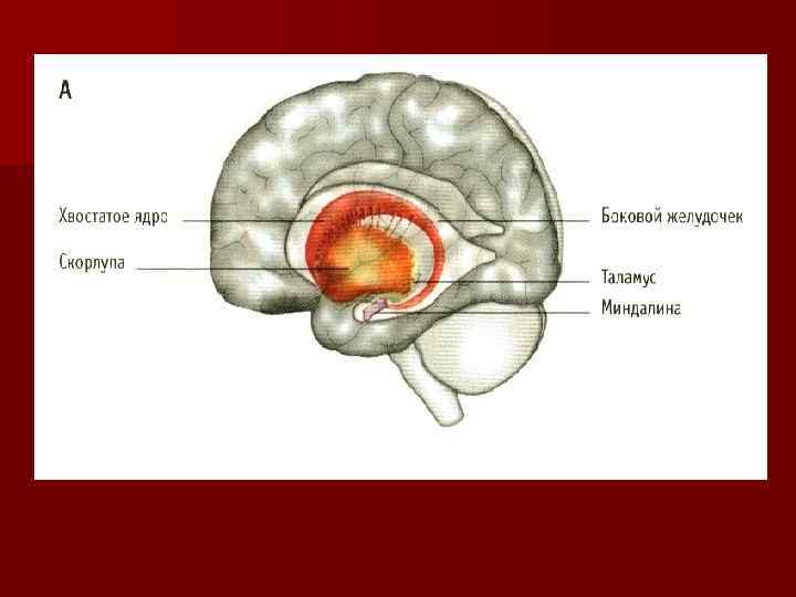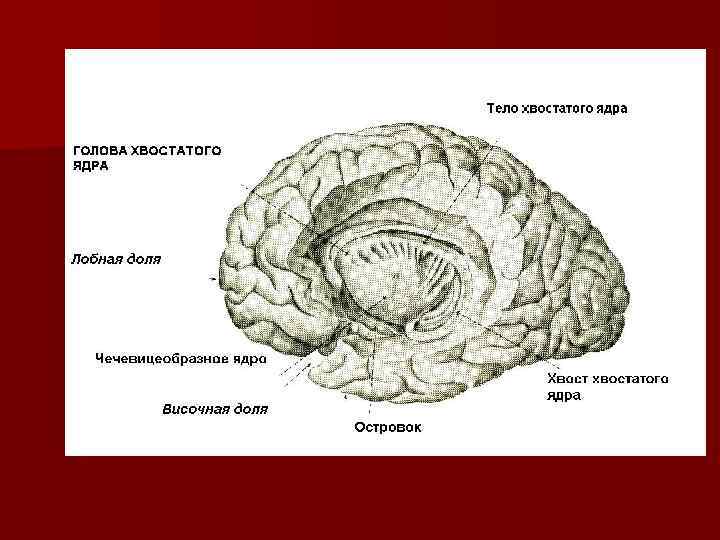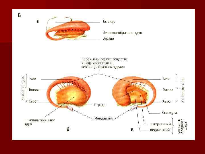 БАЗАЛЬНЫЕ ЯДРА ПОЛУШАРИЙ. n хвостатое ядро, n чечевицеобразное ядро, n ограда n миндалевидное тело