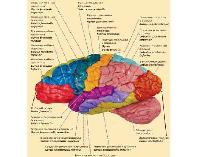 Общий план строения § Конечный мозг имеет вид объемистых полушарий, отделенных друг от друга продольной щелью. § В глубине щели расположено соединяющее их мозолистое тело (кроме мозолистого тела полушария соединяются также передней, задней спайками и спайкой свода). § Каждое полушарие имеет четыре доли: лобную, затылочную, височную, островковую. § Центральная борозда (роландова) отделяет лобную долю от теменной, латеральная борозда (сильвиева) височную от лобной и теменной, теменно-затылочная борозда разделяет теменную и затылочную доли. В глубине латеральной борозды располагается островковая доля. Более мелкие борозды делят доли на извилины.
