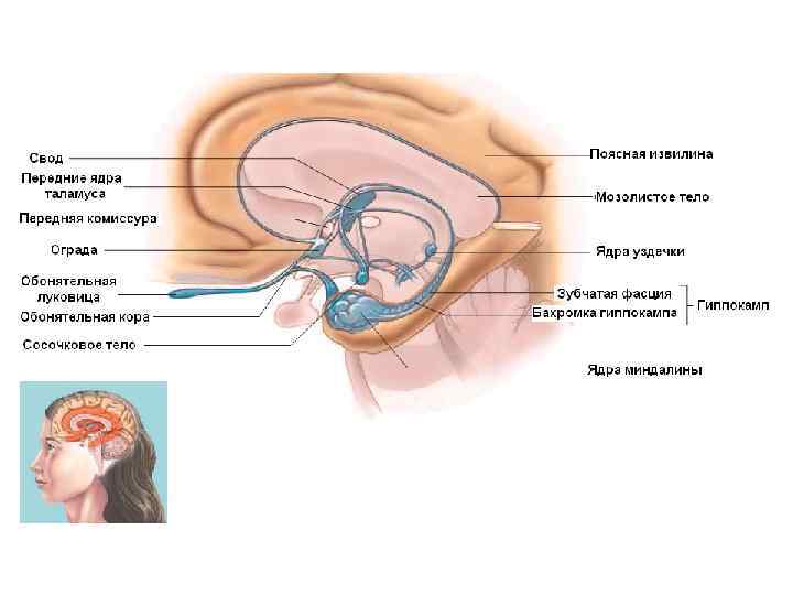 Лимбическая система (круг Пейпца) • Гиппокамп (внутренняя височная извилина) • Зубчатая извилина • Парагиппокампальная извилина • Поясная извилина • Подкорковые ядра (миндалина, ядра перегородки) • Передний таламус и гипоталамус