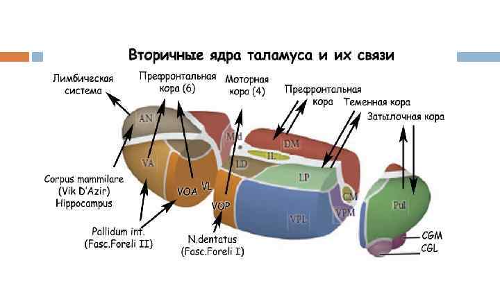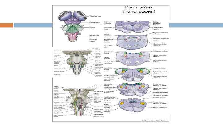 Средний мозг Центр обработки первичной информации (зрение, слух); центр ориентировочных рефлексов (зрение, слух); регуляция мышечного тонуса при реализации автоматических тонических рефлексов; контроль вегетативных функций: жевание, глотание, дыхание, артериальное давление Ядра 3 -4 ЧН