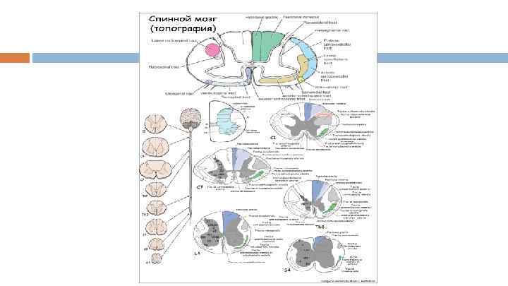 Основные характеристики Располагается в позвоночном канале Покрыт оболочками – твердой, паутинной и мягкой Между оболочками располагается цереброспинальная жидкость (ликвор) Содержит 31 -33 пары спиномозговых сегментов (8 шейных (C), 12 грудных (Th), 5 поясничных (L), 5 крестцовых (S), 1 -3 копчиковых(Co)), от каждого из которых отходят спинальные нервы Размер у взрослого человека 42 -46 см, масса – 34 -38 г Кровоснабжение осуществляется в верхнем отделе из системы позвоночных артерий, ниже из подключичных артерий и ветвей аорты Венозный отток осуществляется в систему позвоночных, межреберных и поясничных вен и далее в нижнюю полую вену