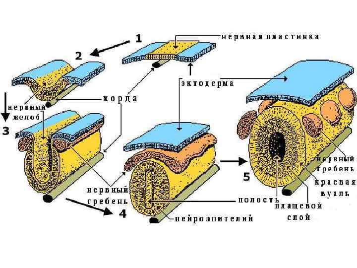 üа - медуллярная пластинка; üб, в - медуллярная бороздка; ü г, д - нервная трубка: 1 - роговой листок (эпидермис); 2 – ганглиозная пластинка