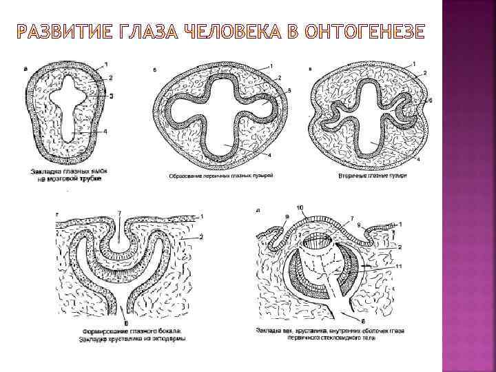 3 нед. Возникновение глазных ямок и их переход в глазные пузыри. Образование эктодермальной пластинки — зачатка линзы. Появление открытой ножки глазного пузыря 4 нед. Образование глазного бокала, хрусталиковой ямки. Врастание артерии стекловидного тела в зародышевую щель глазного бокала. Дифференцирование сетчатки на два слоя вблизи заднего полюса. Образование примитивного диска зрительного нерва 5 нед. Образование хрусталикового пузырька — капсулы линзы, волокон и капсульного эпителия. Возникновение сосудистой сумки линзы, сосудистой сети хориодеи, примитивного нейроэпителия 6 нед. Возникновение капсулозрачковой мембраны, собственных сосудов первичного стекловидного тела, мезодермального стекловидного тела, слоев ганглиозных клеток. Формирование слоев роговицы 7 нед. Возникновение зачатка век. Формирование передних и задних ресничных артерий. Вхождение нервных волокон от ганглиозных клеток в канал зрительного нерва. Развитие стромы радужки. Образование слезных канальцев в виде эпителиальных тяжей 8 нед. Развитие склеры. Возникновение эмбрионального ядра хрусталика. Развитие частичного перекреста нервных волокон в хиазме. Появление зрительного тракта. Формирование орбитальной части слезной железы 9 нед. Срастание краев век. Исчезновение собственных сосудов стекловидного тела. Появление вторичного стекловидного тела 10 нед. Возникновение палочек и колбочек в виде нитевидных отростков 11 нед. Образование глиозного отростка на диске зрительного нерва. Возникновение эктодермальной части радужки, ресничного тела 12 нед. Формирование зародышевого ядра хрусталика с ламбдовидными швами. Конец эмбрионального периода развития 4 мес. Образование сосудистого кольца зрительного нерва (цинново сосудистое кольцо). Возникновение влагалища глазного яблока (тенонова капсула). Формирование мышцы, поднимающей верхнее веко. Появление артерий сетчатки в зоне вокруг диска зрительного нерва 5 мес. Открытие слезных путей в носовую полость 6 мес. Формирование глиальных чехлов вокруг артерии стекловидного тела 7 мес. Исчезновение межзрачковой мембраны и облитерация артерии стекловидного тела. Разъединение сращенных век 8 мес. Развитие решетчатой пластинки зрительного нерва. Исчезновение задней сосудистой сумки линзы 9 мес. Развитие хиазмы и зрительного нерва. Исчезновение сосудов стекловидного тела