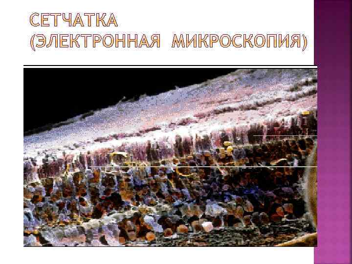 Сетчатка – периферическая часть зрительного анализатора; истинная ткань мозга, вынесенная наружу – выстилает внутреннюю полость глазного яблока