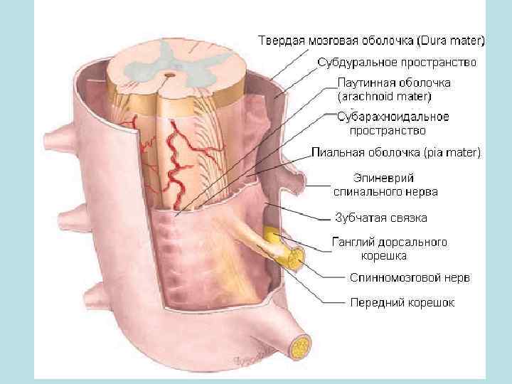 Спинной мозг (оболочки) • твердая : отделена от надкостницы эпидуральным пространством, субдуральное пространство отделяет ее от паутинной оболочки • паутинная : срастается с твердой оболочкой около межпозвоночных отверстий. Подпаутинное (субарахноидальное) пространство за-полнено СМ жидкостью (120 -140 мл) • мягкая (сосудистая) : от нее отходит зубчатая связка (подвешивает мозг в субарахноидальном пространстве)