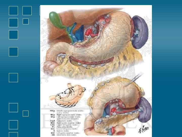 Резекция желудка при злокачественных опухолях • Границы резекции определяют на расстоянии не менее 7 см от края опухоли • Удаляют большой и малый сальник, параортальный , поддиафрагмальные, в воротах печени и по ходу селезеночной артерии лимфатические узы. • Наложение анастамозов производят по наиболее простой модификации анастамозов.