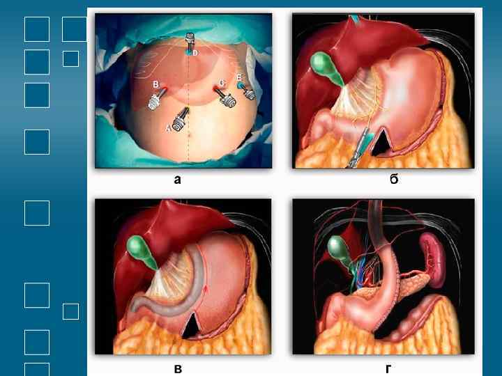 • а- вид культи желудка после подшивания к ней петли тощей кишки; • б- вскрытие просвета желудка путем рассечения задней стенки его участка, бывшего в зажиме; • в - сшивание передней стенки анастомоза; • г - наложение