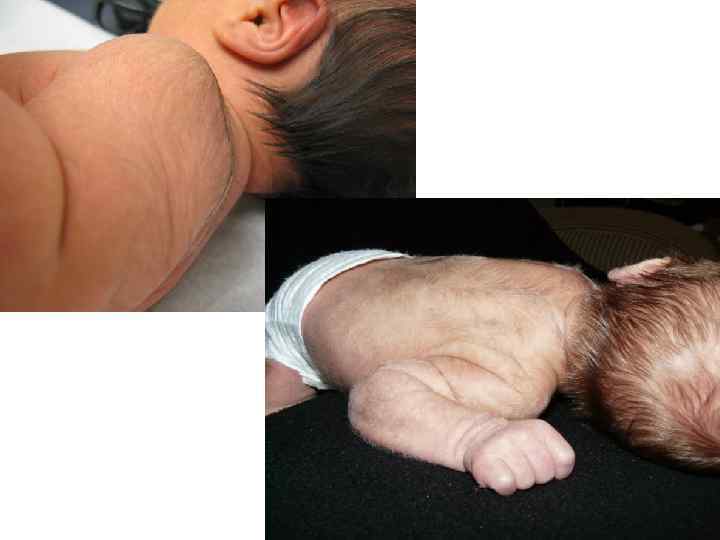 • Подкожная основа у доношенных детей хорошо выражена, жировые отложения состоят из большого количества тугоплавких кислот пальмитиновой и стеариновой, вследствие чего под влиянием охлаждения, обезвоживания и других факторов кожа может уплотняться и отекать. • Пушковые волосы (лануго) покрывают верхний отдел спины, плечи, лоб новорожденного. • У доношенных детей ногти покрывают ногтевое ложе, доходя до края фаланг, у недоношенных нередко не доходят до кончиков пальцев. • Subcutaneous basis in full-term infants are well defined, body fat consist of a large number of refractory palmitic and stearic acids, resulting under the influence of cooling, dehydration and other factors, the skin may thicken and swell. • Vellus hair (lanugo) cover the upper back, shoulders, forehead of a newborn. • In full-term infants fingernails cover the nail bed, reaching the edge of the phalanges, preterm often do not reach the fingertips.