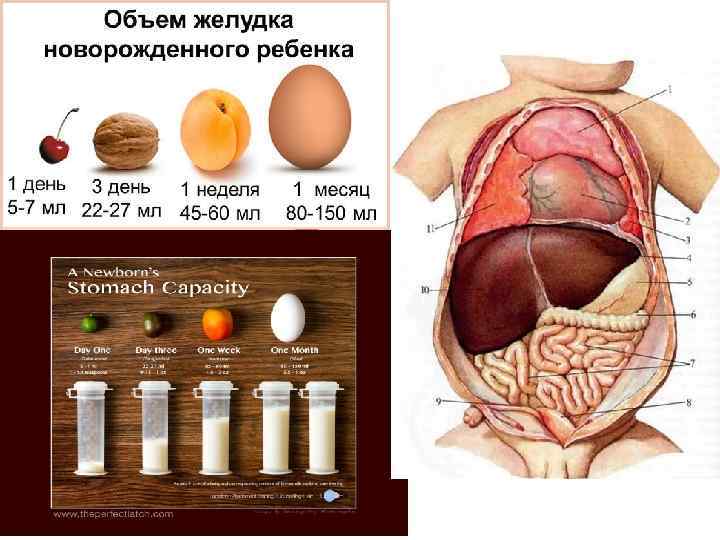 • Желудок доношенного ребенка в первые дни жизни вмещает 30— 35 мл жидкости. Мышцы кардиальной части желудка менее развиты, чем мышцы привратника, вследствие чего у новорожденных легко возникают рвота и срыгивание при заглатывании ребенком воздуха (аэрофагия), повышенной возбудимости, перекорме, при некоторых заболеваниях. • Желудочный и кишечный соки у новорожденного по составу такие же, как у взрослого, однако кислотность желудочного сока и активность ферментов в несколько раз меньше, чем у взрослого. • Слизистая оболочка кишок отличается повышенной проницаемостью для микробов и токсинов, что объясняется особенностями ее строения: она нежна, богато снабжена кровеносными сосудами, лимфатическими узлами, ворсинками, легко ранима.