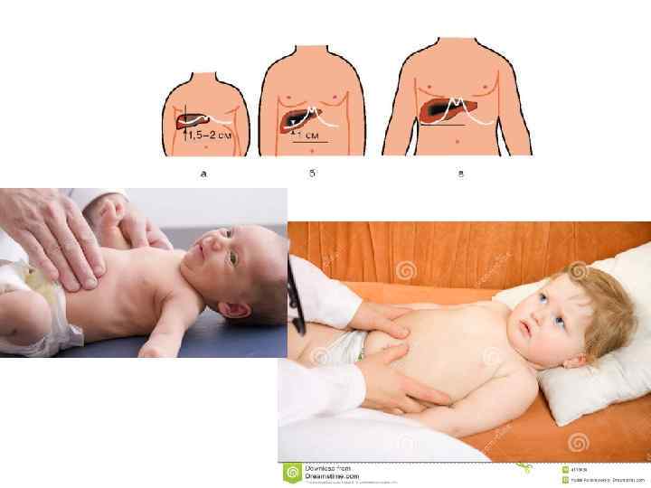 • Печень новорожденного имеет большие размеры, полнокровна, бедна соединительной тканью. При пальпации нижний край ее закруглен, на 1, 5— 2 см может выступать из-под края реберной дуги. В печени содержится недостаточное количество фермента глюкоронилтрансферазы, что предрасполагает к развитию желтухи. Кроме того, снижен синтез протромбина и других факторов свертывания крови, что обусловливает предрасположенность к геморрагическому синдрому. • The liver of the newborn is large, fulfilling, and poor connective tissue. On palpation the lower edge of its rounded, 1. 5— 2 cm may protrude from under the edge of costal arc. The liver contains an insufficient amount of enzyme glucuronyltransferase that predisposes to the development of jaundice. In addition, the reduced synthesis of prothrombin and other coagulation factors, resulting in a predisposition to hemorrhagic syndrome.