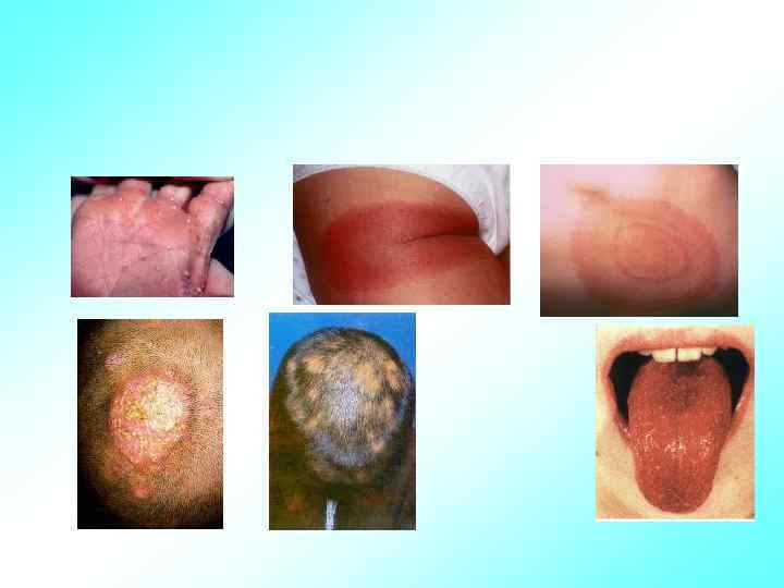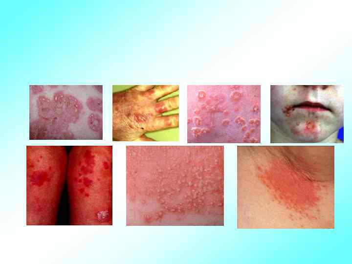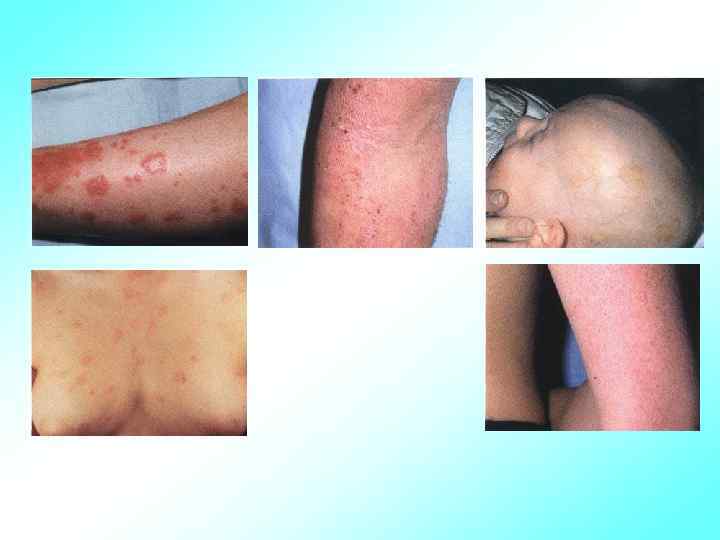 Аллергический диатез • гнейс (себорея) жирные чешуйки на голове, лбу, надбровных дугах, покрытые корочкой • эритема – покраснение • опрелости (intertrigo) мокнущее раздражение, локализуется в местах наибольшего трения кожи подмышечных и паховых участков, промежности, за ушами и на шее