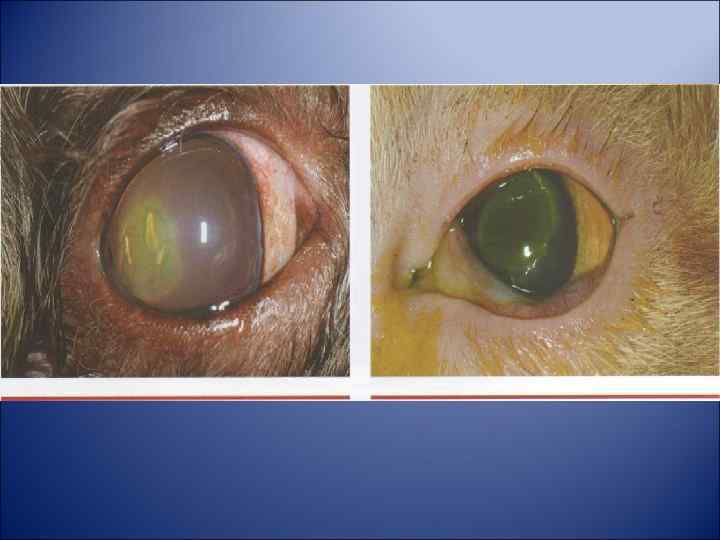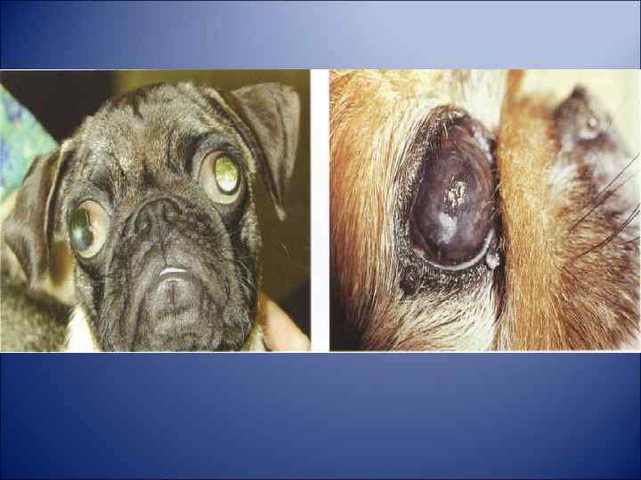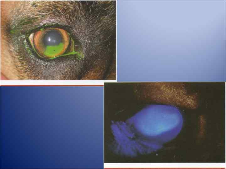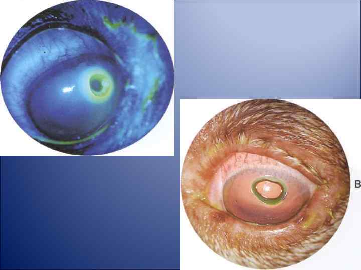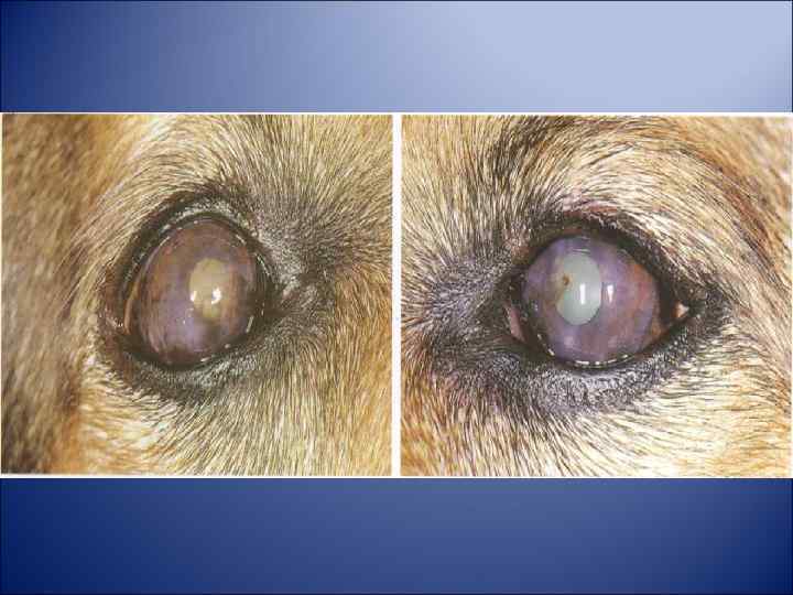 Лечение: антибиотик + кератопротектор, поверхностные язвы 4 -5 раз в день, глубокие 7 -8 раз в день, + противовирусные + нестероидные противоваспалительные (если отек) + антииоксиданты + цикломед или атропин Для рассасывания рубца кортикостероиды (макситрол, гаразон) на 2 недели Защитный воротник Хирургическое : тарзорафия, донорская или искусственная роговица, аллоплант, лоскут. При нейротрофических язвах (боксеры, таксы) – послойная кератопластика, точечная или решетчатая кератэктомия, прижигание йодом