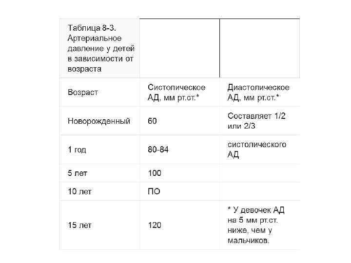 Для определения АД у детей старше года можно пользоваться следующими формулами: АД сист = 90 + 2 п (мм рт. ст. ), АД диаст = 60 + п (мм РТ-СТ-), где п — возраст в годах. У здоровых детей АД в артериях правых и левых конечностей существенно не отличается. На ногах показатели АД на 10— 15 мм рт. ст. выше, чем на руках. Пульсовое давление — разность между систолическим и диастолическим АД (пропорционально количеству крови, выбрасываемой сердцем при каждой систоле). С возрастом пульсовое давление увеличивается: у новорожденных оно составляет, в среднем, 42 мм рт. ст. , у детей в возрасте 5— 6 лет — 44 мм рт. ст. , в 14— 15 лет — 52 мм рт. ст.