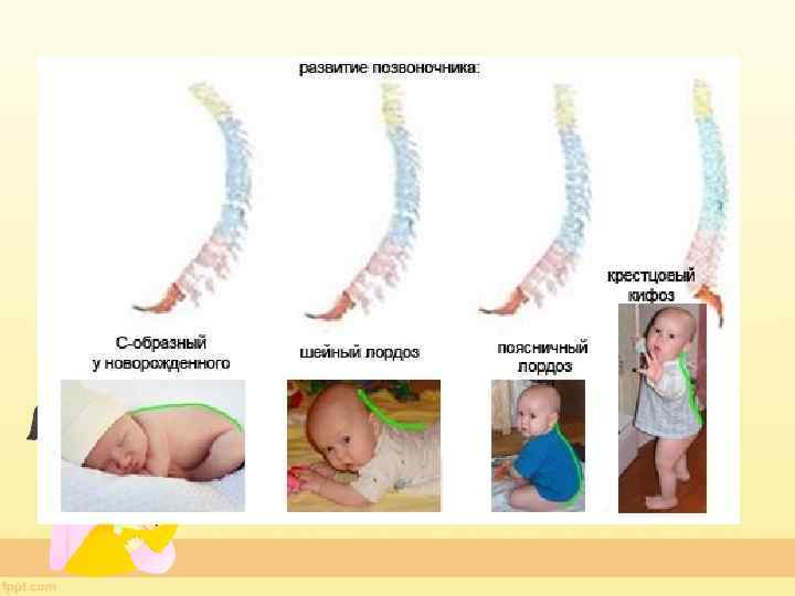 Большой родничок сохраняется практически в течение всего l-го года жизни и закрывается к 12 -16 месяцам: Формируются изгибы позвоночника: - к 2 месяцам, когда ребенок начинает самостоятельно держать голову, появляется шейный лордоз (изгиб кпереди в сагиттальной плоскости); - к 6 месяцам, когда ребенок начинает самостоятельно сидеть, появляется грудной кифоз (изгиб кзади в саггитальной плоскости); - к 12 месяцам, когда ребенок начинает самостоятельно ходить, появляется поясничный лордоз.