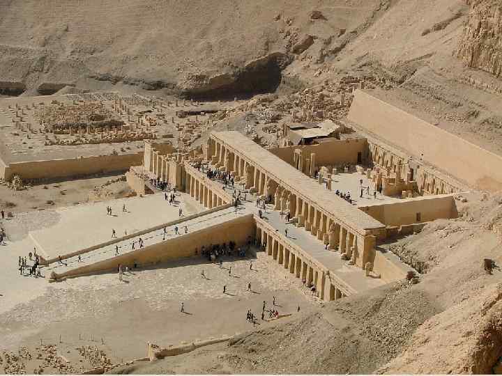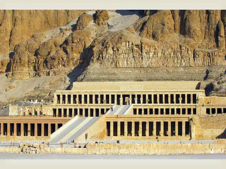 Mortuary Temple of Hatshepsut Her temple was not a construction of stone masses as in the pyramids It was rather a play of the emptiness of terraces, ramps and courtyards against the busy background of the cliffs Her temple captures the shift from the compact geometry of the old kingdom pyramids to the linear composition of the New Kingdom temples