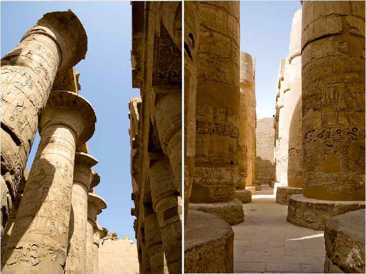 Arrangement of the hypostyle hall consist of 134 columns arranged in 16 rows; 7 rows of smaller columns on each side framing 2 rows of larger columns The larger columns are higher and have a higher roof Smaller columns were of closed papyrus bud, while the larger ones were of open buds The open buds of the higher column combined with lighting from the clerestory window creates an effect of lifting towards light