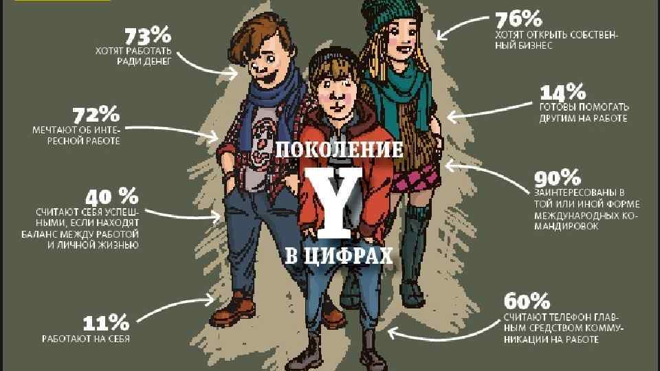 На работе они могут быть эффективными, они способны быстро выполнять задачи, темп жизни этого поколения быстрее, что может проявляться в том числе и в нетерпеливости молодых людей. В то же время они больше уверены в себе, они не боятся чаще обращать на себя внимание и высказывать новые мысли и идеи. Ленка Червена, Директор по подбору персонала компании IKEA Они работают и учатся в одно и то же время. Они талантливы, не испытывают трепета перед авторитетами, полны противоречий и не могут долго сосредотачивать внимание на чем-то одном. Они быстро начинают скучать, поэтому предпочитают профессиональную и социальную мобильность стабильному рабочему месту. Моти Кристал, журнал Forbes Статус и возможность обретения стабильности, повышения благосостояния не стимулируют их работать на износ. Они ценят возможности постоянного обучения, творческой самореализации, привнесения изменений, ценят разнообразие задач и свободу принятия решений. Галина Рогозина, журнал Ros. Expert