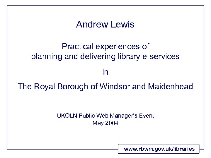 Andrew Lewis Practical experiences of planning and delivering library e-services in The Royal Borough of Windsor and Maidenhead UKOLN Public Web Manager’s Event May 2004 www. rbwm. gov. uk/libraries