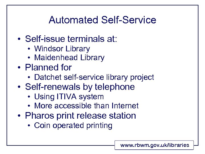 Automated Self-Service • Self-issue terminals at: • Windsor Library • Maidenhead Library • Planned for • Datchet self-service library project • Self-renewals by telephone • Using ITIVA system • More accessible than Internet • Pharos print release station • Coin operated printing www. rbwm. gov. uk/libraries