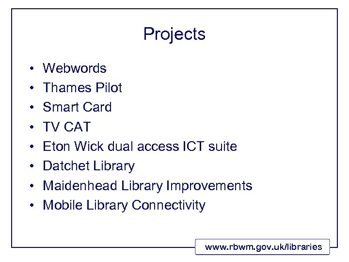 Projects • • Webwords Thames Pilot Smart Card TV CAT Eton Wick dual access ICT suite Datchet Library Maidenhead Library Improvements Mobile Library Connectivity www. rbwm. gov. uk/libraries