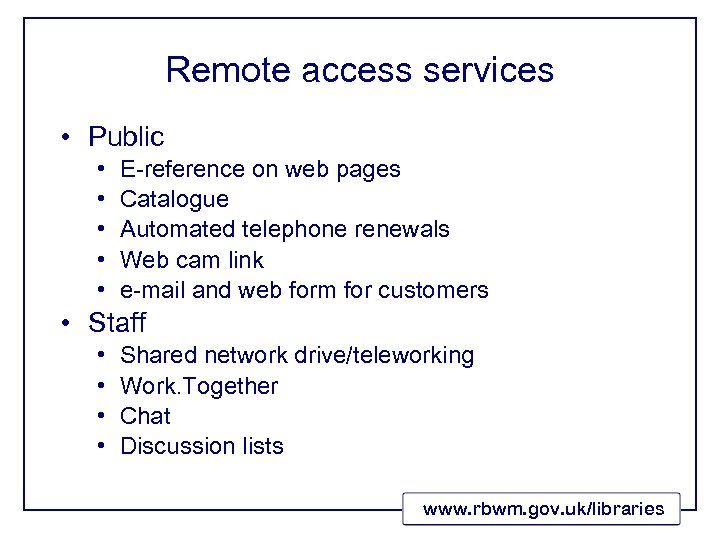 Remote access services • Public • • • E-reference on web pages Catalogue Automated telephone renewals Web cam link e-mail and web form for customers • • Shared network drive/teleworking Work. Together Chat Discussion lists • Staff www. rbwm. gov. uk/libraries